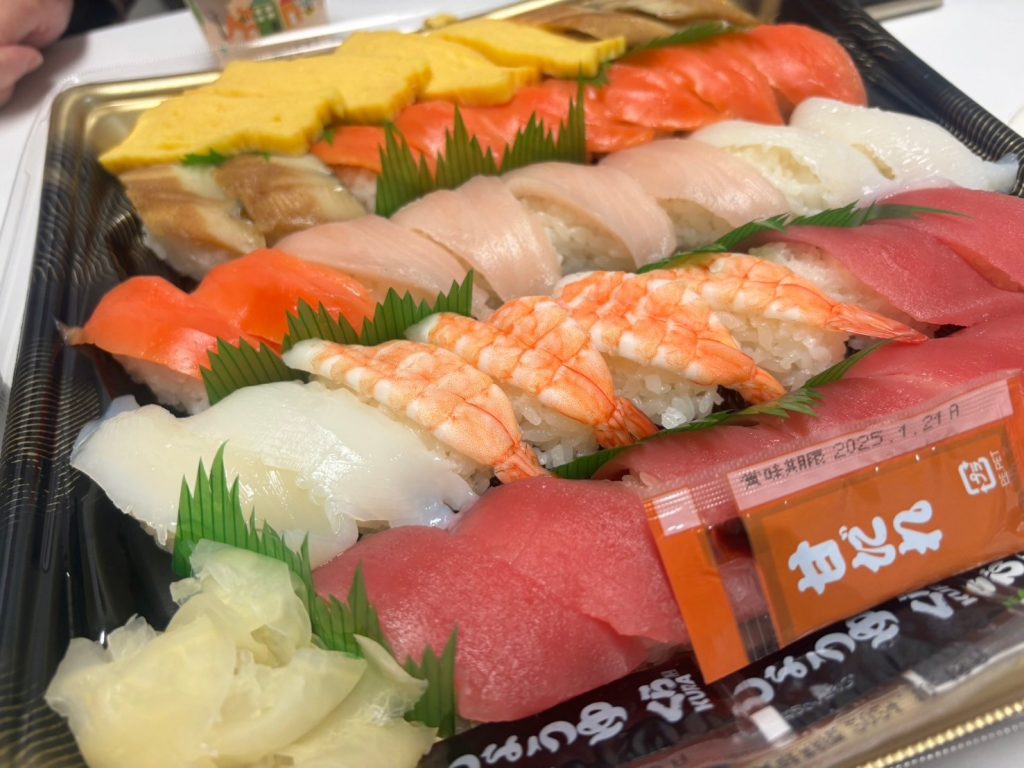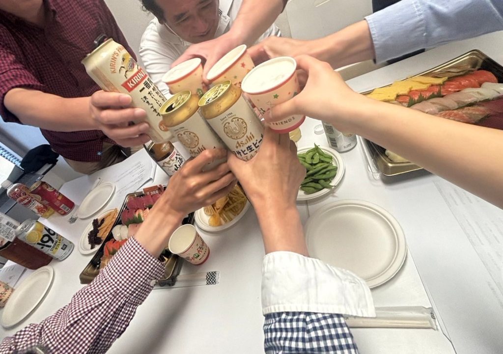 総会の後はお待ちかねの懇親会、寿司を囲んで乾杯です。