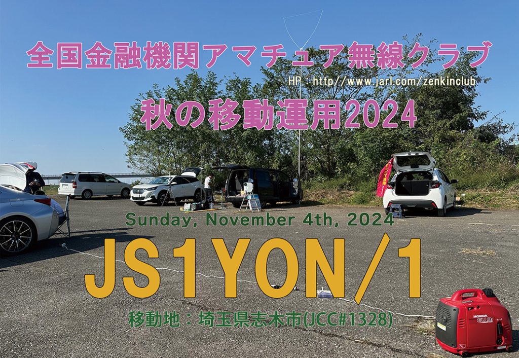 去る2024年11月4日、埼玉県志木市の荒川土手にて「秋の移動運用2024」が開催され、昨年を上回る204局と交信することができました。お相手いただいた各局ありがとうございました。お相手いただいた各局には、後日こちらのQSLカードをお送りさせていただきます。